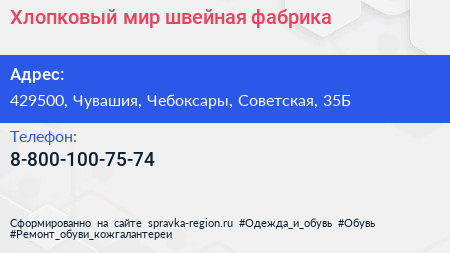 Хлопковый мир, швейная фабрика по адресу 429500, Чувашия, Чебоксары, Советская, 35Б в дальнейшем Организация, размещена в следующих категориях: