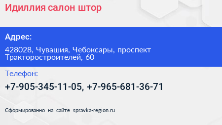 Идиллия, салон штор по адресу 428028, Чувашия, Чебоксары, проспект Тракторостроителей, 60 в дальнейшем Организация, размещена в следующих категориях:
