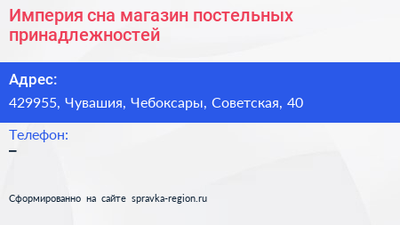 Империя сна, магазин постельных принадлежностей по адресу 429955, Чувашия, Чебоксары, Советская, 40 в дальнейшем Организация, размещена в следующих категориях: