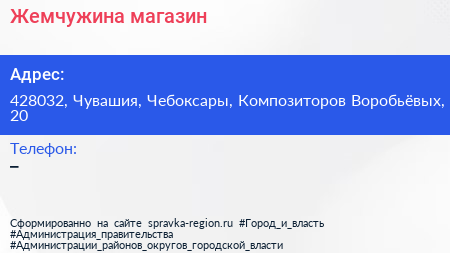 Жемчужина, магазин по адресу 428032, Чувашия, Чебоксары, Композиторов Воробьёвых, 20 в дальнейшем Организация, размещена в следующих категориях: