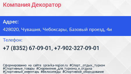 Компания Декоратор по адресу 428020, Чувашия, Чебоксары, Базовый проезд, 4и в дальнейшем Организация, размещена в следующих категориях: