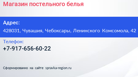 Магазин постельного белья по адресу 428031, Чувашия, Чебоксары, Ленинского Комсомола, 42 в дальнейшем Организация, размещена в следующих категориях: