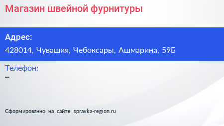 Магазин швейной фурнитуры по адресу 428014, Чувашия, Чебоксары, Ашмарина, 59Б в дальнейшем Организация, размещена в следующих категориях: