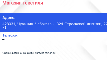 Магазин текстиля по адресу 428031, Чувашия, Чебоксары, 324 Стрелковой дивизии, 22 к1 в дальнейшем Организация, размещена в следующих категориях: