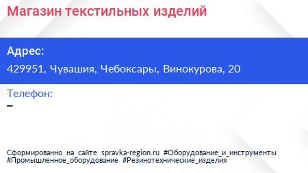 Магазин текстильных изделий по адресу 429951, Чувашия, Чебоксары, Винокурова, 20 в дальнейшем Организация, размещена в следующих категориях: