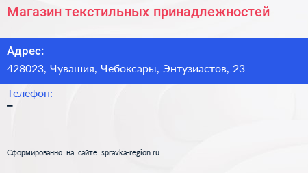 Магазин текстильных принадлежностей по адресу 428023, Чувашия, Чебоксары, Энтузиастов, 23 в дальнейшем Организация, размещена в следующих категориях: