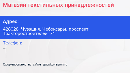 Магазин текстильных принадлежностей по адресу 428028, Чувашия, Чебоксары, проспект Тракторостроителей, 71 в дальнейшем Организация, размещена в следующих категориях: