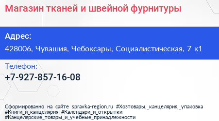 Магазин тканей и швейной фурнитуры по адресу 428006, Чувашия, Чебоксары, Социалистическая, 7 к1 в дальнейшем Организация, размещена в следующих категориях: