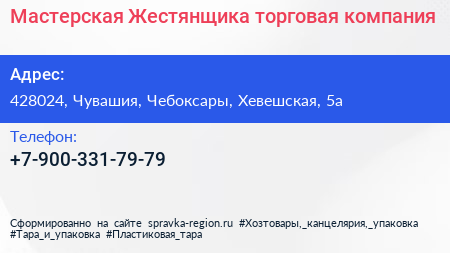 Мастерская Жестянщика, торговая компания по адресу 428024, Чувашия, Чебоксары, Хевешская, 5а в дальнейшем Организация, размещена в следующих категориях: