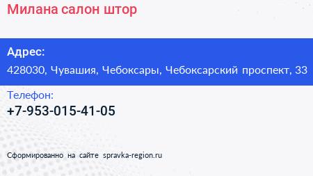 Милана, салон штор по адресу 428030, Чувашия, Чебоксары, Чебоксарский проспект, 33 в дальнейшем Организация, размещена в следующих категориях: