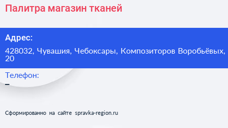 Палитра, магазин тканей по адресу 428032, Чувашия, Чебоксары, Композиторов Воробьёвых, 20 в дальнейшем Организация, размещена в следующих категориях: