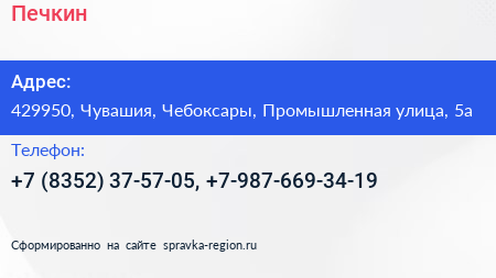 Печкин по адресу 429950, Чувашия, Чебоксары, Промышленная улица, 5а в дальнейшем Организация, размещена в следующих категориях: