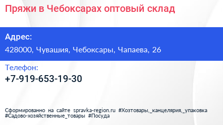 Пряжи в Чебоксарах, оптовый склад по адресу 428000, Чувашия, Чебоксары, Чапаева, 26 в дальнейшем Организация, размещена в следующих категориях: