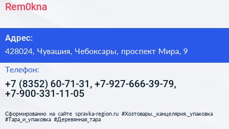Rem0kna по адресу 428024, Чувашия, Чебоксары, проспект Мира, 9 в дальнейшем Организация, размещена в следующих категориях: