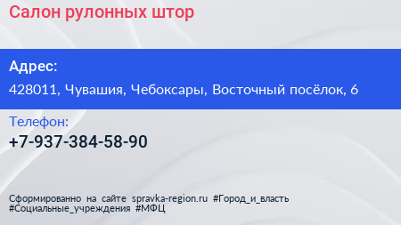 Салон рулонных штор по адресу 428011, Чувашия, Чебоксары, Восточный посёлок, 6 в дальнейшем Организация, размещена в следующих категориях: