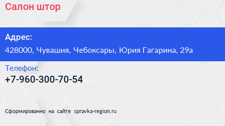 Салон штор по адресу 428000, Чувашия, Чебоксары, Юрия Гагарина, 29а в дальнейшем Организация, размещена в следующих категориях: