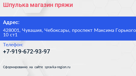 Шпулька, магазин пряжи по адресу 428001, Чувашия, Чебоксары, проспект Максима Горького, 10 ст1 в дальнейшем Организация, размещена в следующих категориях: