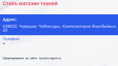 Стиль, магазин тканей по адресу 428032, Чувашия, Чебоксары, Композиторов Воробьёвых, 20 в дальнейшем Организация, размещена в следующих категориях: