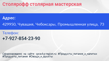 Столярофф, столярная мастерская по адресу 429950, Чувашия, Чебоксары, Промышленная улица, 73 в дальнейшем Организация, размещена в следующих категориях: