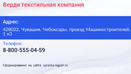 Верди, текстильная компания по адресу 428022, Чувашия, Чебоксары, проезд Машиностроителей, 1 к3 в дальнейшем Организация, размещена в следующих категориях: