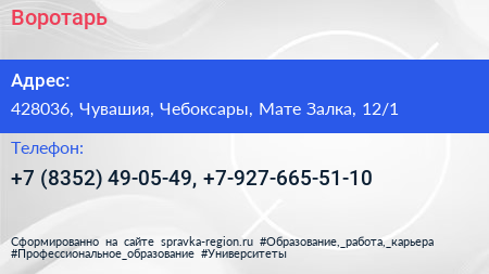 Воротарь по адресу 428036, Чувашия, Чебоксары, Мате Залка, 12/1 в дальнейшем Организация, размещена в следующих категориях: