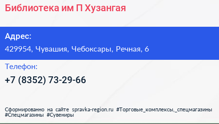 Библиотека им. П. Хузангая по адресу 429954, Чувашия, Чебоксары, Речная, 6 в дальнейшем Организация, размещена в следующих категориях: