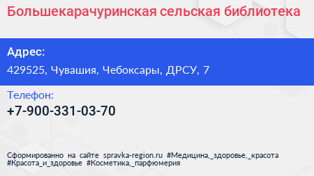 Большекарачуринская сельская библиотека по адресу 429525, Чувашия, Чебоксары, ДРСУ, 7 в дальнейшем Организация, размещена в следующих категориях:
