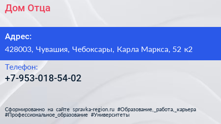 Дом Отца по адресу 428003, Чувашия, Чебоксары, Карла Маркса, 52 к2 в дальнейшем Организация, размещена в следующих категориях: