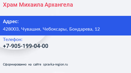 Храм Михаила Архангела по адресу 428003, Чувашия, Чебоксары, Бондарева, 12 в дальнейшем Организация, размещена в следующих категориях: