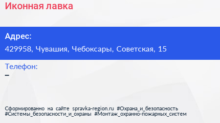 Иконная лавка по адресу 429958, Чувашия, Чебоксары, Советская, 15 в дальнейшем Организация, размещена в следующих категориях: