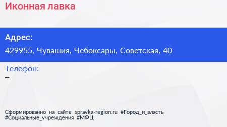 Иконная лавка по адресу 429955, Чувашия, Чебоксары, Советская, 40 в дальнейшем Организация, размещена в следующих категориях: