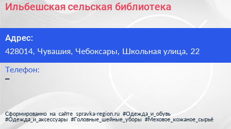 Ильбешская сельская библиотека по адресу 428014, Чувашия, Чебоксары, Школьная улица, 22 в дальнейшем Организация, размещена в следующих категориях: