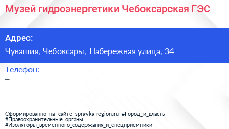 Музей гидроэнергетики, Чебоксарская ГЭС по адресу Чувашия, Чебоксары, Набережная улица, 34 в дальнейшем Организация, размещена в следующих категориях: