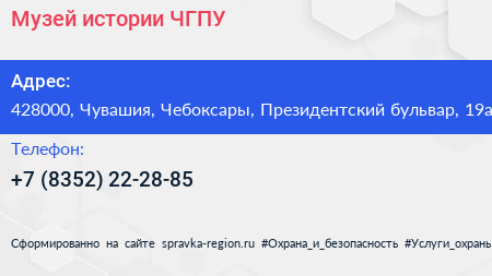 Музей истории ЧГПУ по адресу 428000, Чувашия, Чебоксары, Президентский бульвар, 19а в дальнейшем Организация, размещена в следующих категориях: