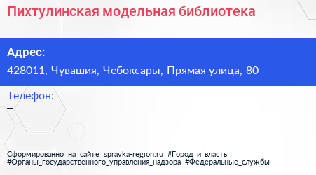 Пихтулинская модельная библиотека по адресу 428011, Чувашия, Чебоксары, Прямая улица, 80 в дальнейшем Организация, размещена в следующих категориях: