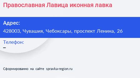 Православная Лавица, иконная лавка по адресу 428003, Чувашия, Чебоксары, проспект Ленина, 26 в дальнейшем Организация, размещена в следующих категориях: