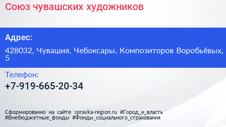 Союз чувашских художников по адресу 428032, Чувашия, Чебоксары, Композиторов Воробьёвых, 5 в дальнейшем Организация, размещена в следующих категориях:
