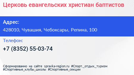 Церковь евангельских христиан-баптистов по адресу 428010, Чувашия, Чебоксары, Репина, 100 в дальнейшем Организация, размещена в следующих категориях: