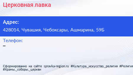 Церковная лавка по адресу 428014, Чувашия, Чебоксары, Ашмарина, 59Б в дальнейшем Организация, размещена в следующих категориях: