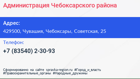 Администрация Чебоксарского района по адресу 429500, Чувашия, Чебоксары, Советская, 25 в дальнейшем Организация, размещена в следующих категориях:
