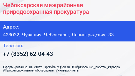 Чебоксарская межрайонная природоохранная прокуратура по адресу 428032, Чувашия, Чебоксары, Ленинградская, 33 в дальнейшем Организация, размещена в следующих категориях: