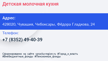 Детская молочная кухня по адресу 428020, Чувашия, Чебоксары, Фёдора Гладкова, 24 в дальнейшем Организация, размещена в следующих категориях: