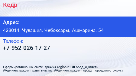 Кедр по адресу 428014, Чувашия, Чебоксары, Ашмарина, 54 в дальнейшем Организация, размещена в следующих категориях: