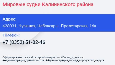 Мировые судьи Калининского района по адресу 428031, Чувашия, Чебоксары, Пролетарская, 16а в дальнейшем Организация, размещена в следующих категориях: