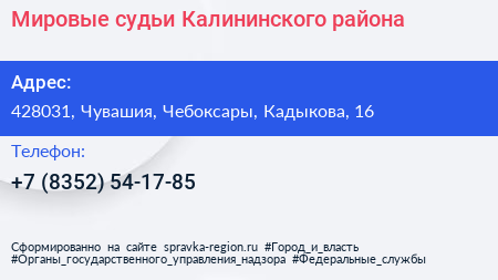 Мировые судьи Калининского района по адресу 428031, Чувашия, Чебоксары, Кадыкова, 16 в дальнейшем Организация, размещена в следующих категориях: