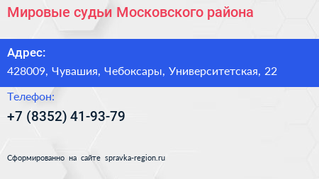 Мировые судьи Московского района по адресу 428009, Чувашия, Чебоксары, Университетская, 22 в дальнейшем Организация, размещена в следующих категориях: