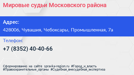 Мировые судьи Московского района по адресу 428006, Чувашия, Чебоксары, Промышленная, 7а в дальнейшем Организация, размещена в следующих категориях: