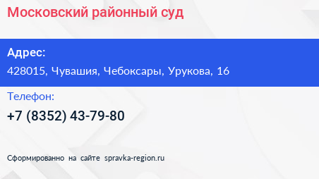 Московский районный суд по адресу 428015, Чувашия, Чебоксары, Урукова, 16 в дальнейшем Организация, размещена в следующих категориях: