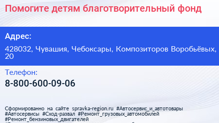 Помогите детям, благотворительный фонд по адресу 428032, Чувашия, Чебоксары, Композиторов Воробьёвых, 20 в дальнейшем Организация, размещена в следующих категориях: