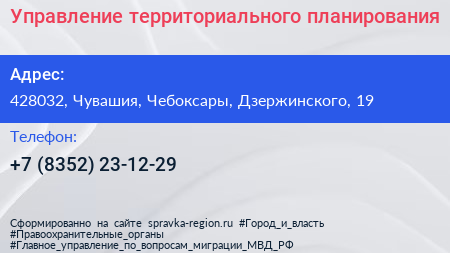 Управление территориального планирования по адресу 428032, Чувашия, Чебоксары, Дзержинского, 19 в дальнейшем Организация, размещена в следующих категориях: